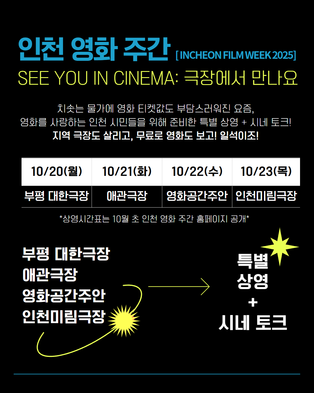 »çÀü ½ÅûÀ» ÇϽøé 10/20(¿ù)~10/23(¸ñ)±îÁö, 4Àϰ£ ÀÎõ ³» Áö¿ª±ØÀå ³× °÷¿¡¼ ÀÎõ ¿µÈ ÁÖ°£ 2025 Ưº°»ó¿µ°ú ½Ã³×ÅäÅ©¸¦ Áñ±â½Ç ¼ö ÀÖ½À´Ï´Ù! (»ó¿µÀÛÀº 10¿ù ÃÊ ÀÎõ ¿µÈ ÁÖ°£ ȨÆäÀÌÁö¿¡ °ø°³ µÈ´ë¿ä!🤗)