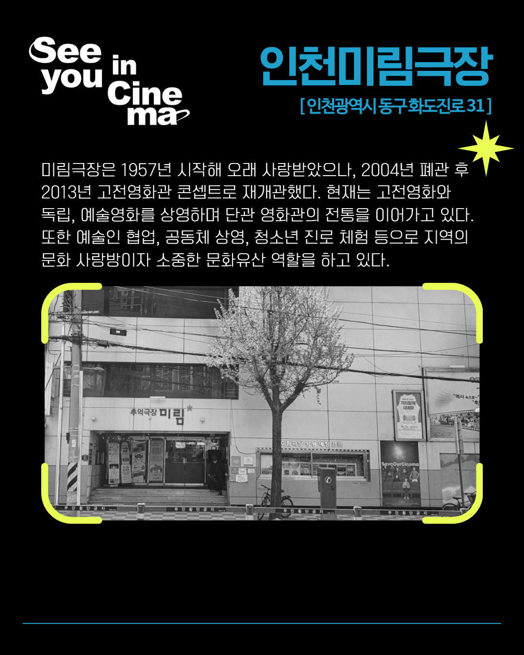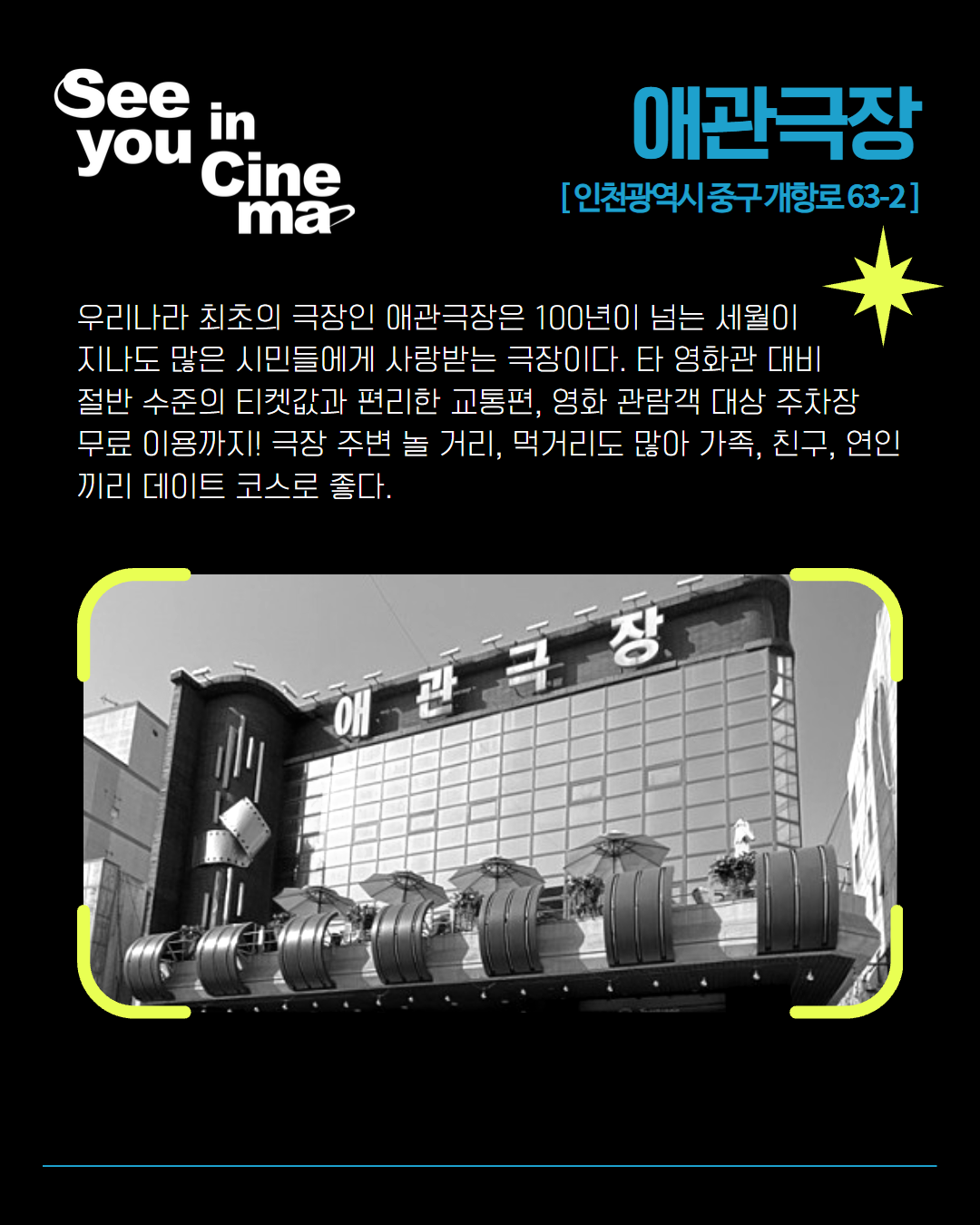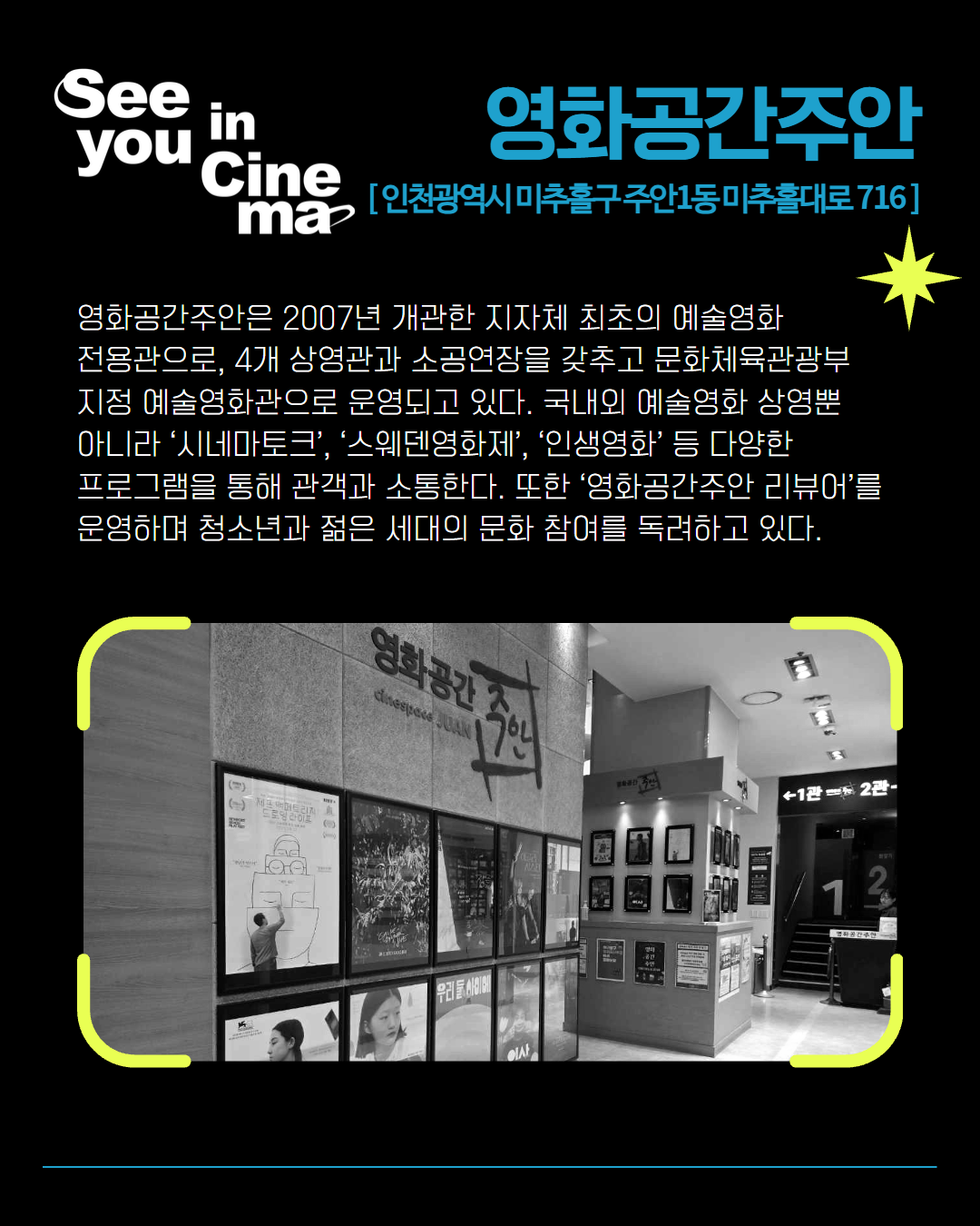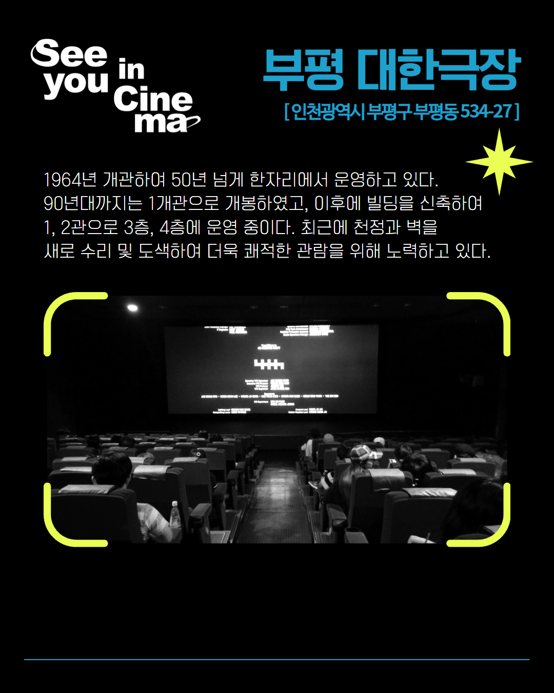ÀÎõÀÇ Áö¿ª±ØÀå Ȱ¼ºÈ¸¦ À§ÇØ ÀÎõ ¿µÈ ÁÖ°£¿¡¼ ÁøÇàµÇ´Â ÇÁ·ÎÁ§Æ® <SEE YOU IN CINEMA>¿¡ ¿µÈ°ø°£Á־ȵµ ÇÔ²²ÇÕ´Ï´Ù!